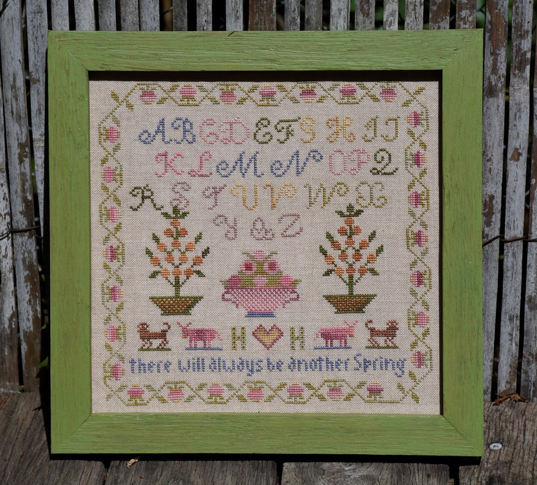 The colours of this sampler make me think of Spring, and I decided to chart two versions: one that is a strict reproduction and one that is my adaptation, which I called ‘Another Spring’. The quotation is taken from LM Montgomery, to evoke hope and renewal.