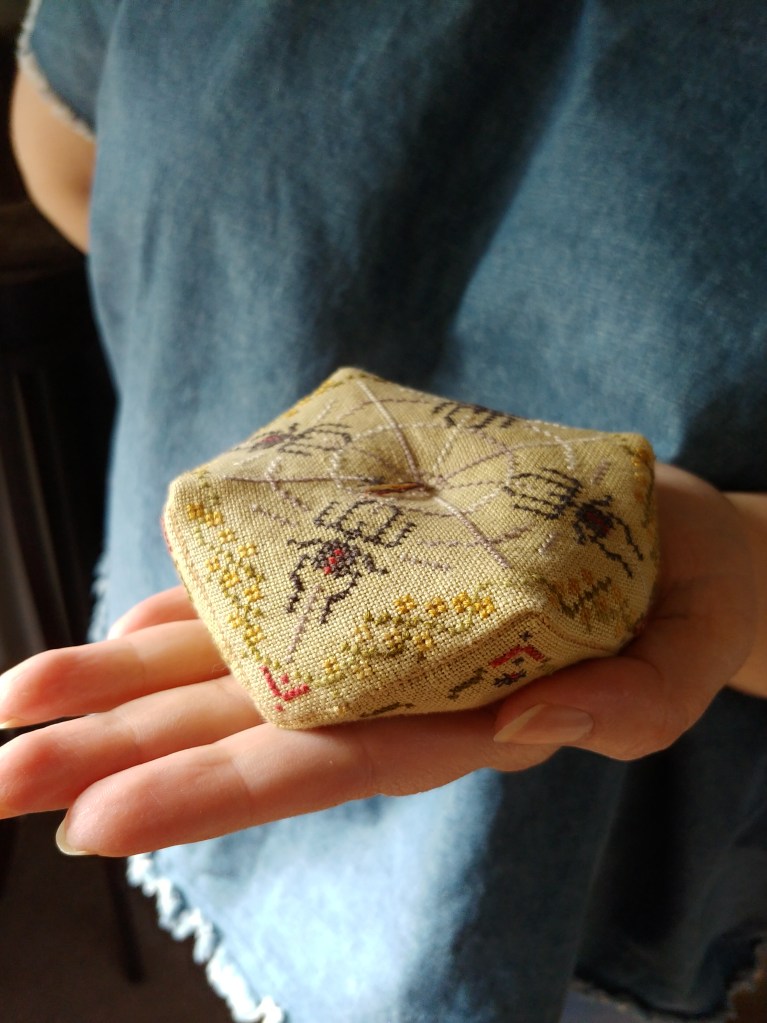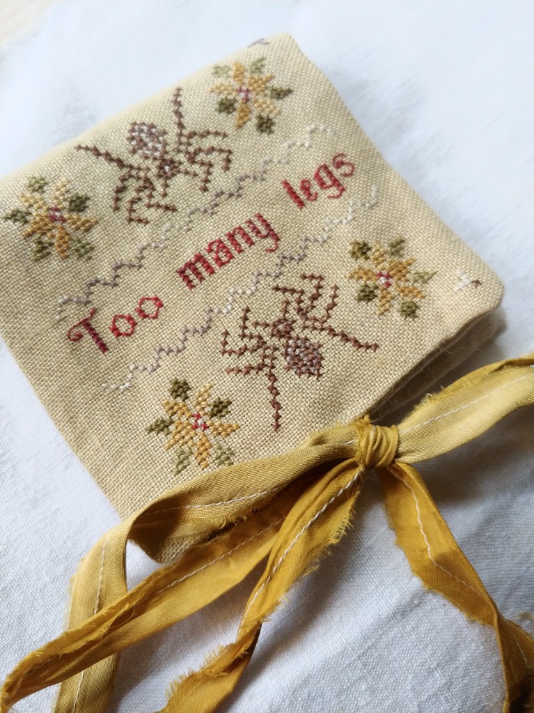 In this finish in particular, I didn’t use buttons to tie the centre of the completed biscornu together – I used 8 or so scraps of thread left over from stitching. I threaded these together on a sharp embroidery needle with a large eye and tied a simple knot about 1.5 centimetres from the end. Starting from the top of the biscornu, I sewed this through the centre of the web, leaving the knot on the outside of the fabric.