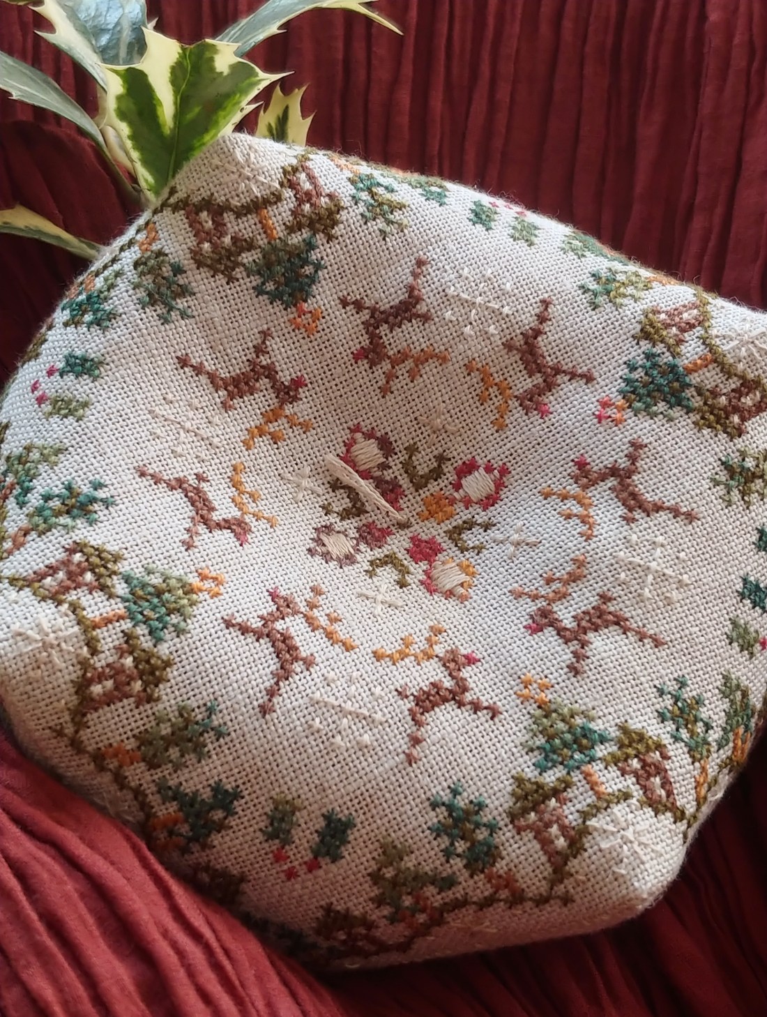 The lovely Kerrilyn at A Stitch in Time in Hobart asked me to create a Christmas-themed biscornu for this year’s Christmas in July retreat. I love getting design prompts, as it helps me come up with designs that I may not have created on my own! I had a lot of fun playing with traditional Christmas motifs such as red-nosed reindeers, snowflakes and little Christmas cottages hidden in a Christmas forest.