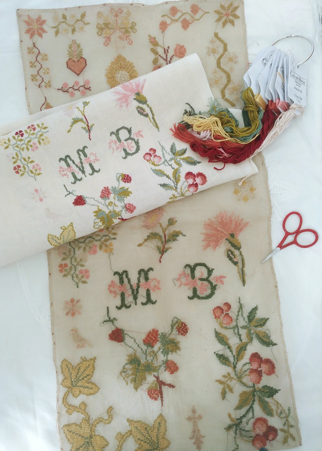 Working with antique samplers is such a privilege. While my collection mostly consists of the damaged, neglected and in need of saving, I have found a particular love of French samplers. Typically very floral, there’s a lightness and delicacy about them that keeps me intrigued.